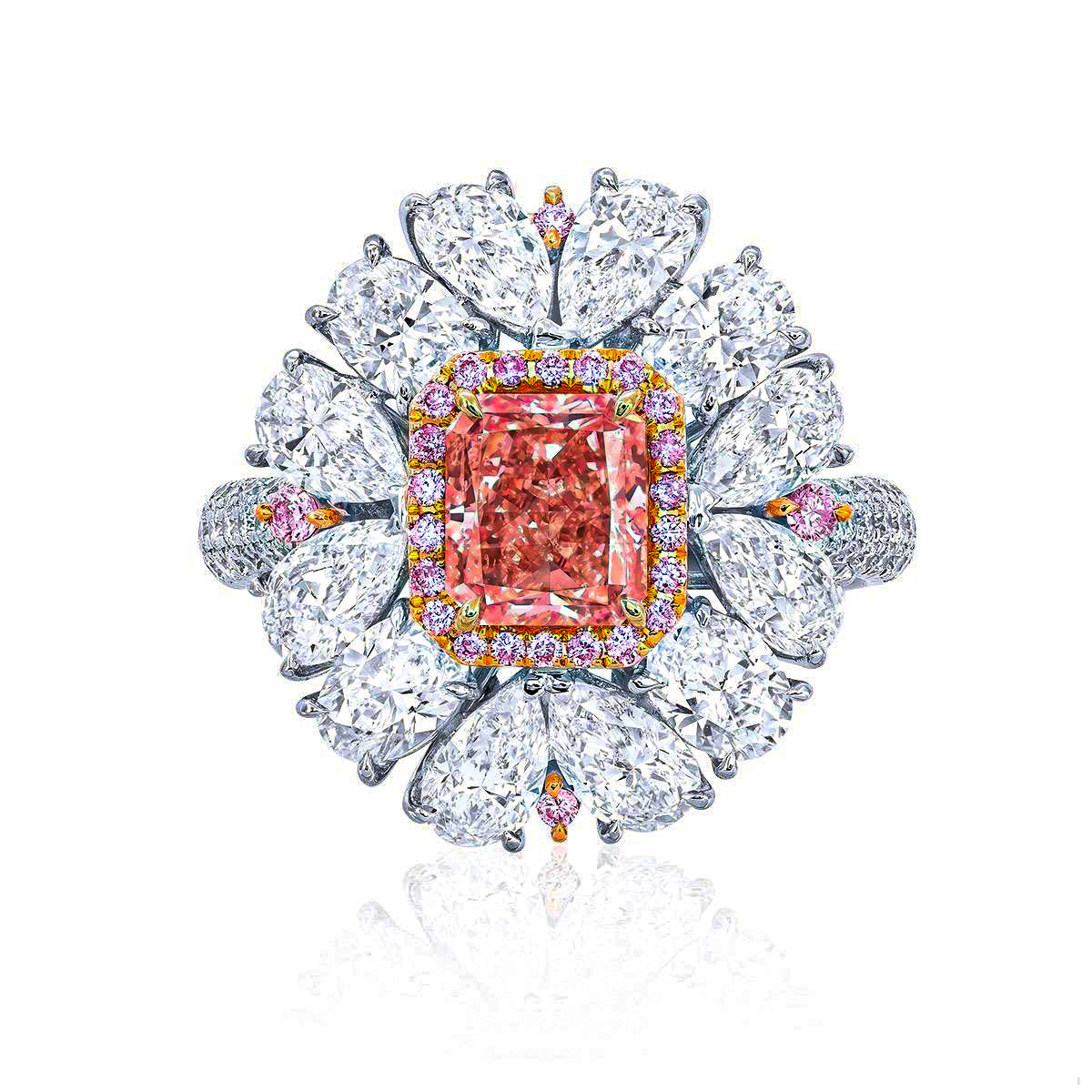 Accent Stones: 58 white diamonds totaling about 0.39 carats, 26 pink diamonds totaling about 0.15 carats, 8 fancy-turned peardrop diamonds totaling about 1.89 carats, 4 fancy-turning oval white diamonds totaling about 0.95 carats, 18